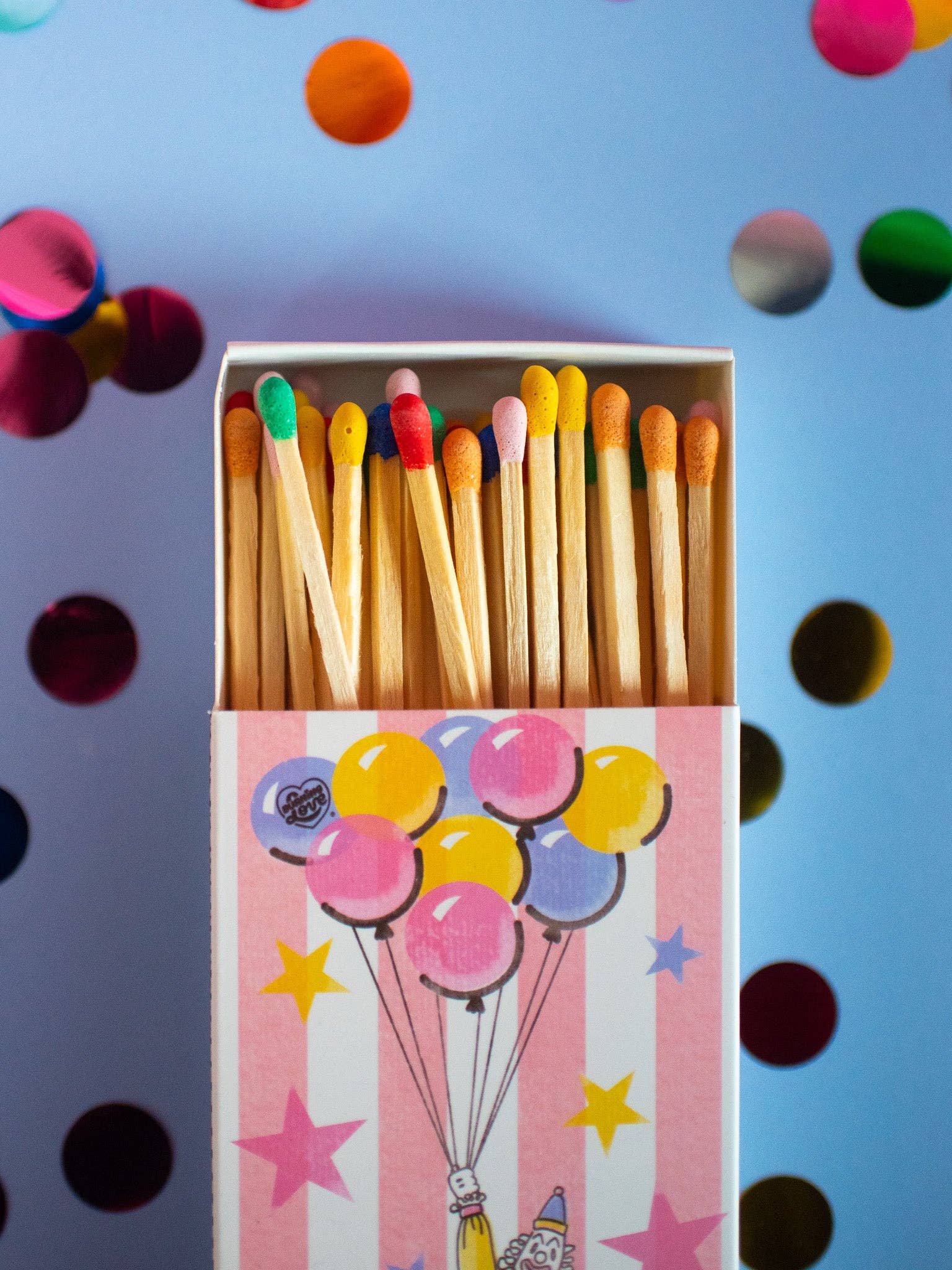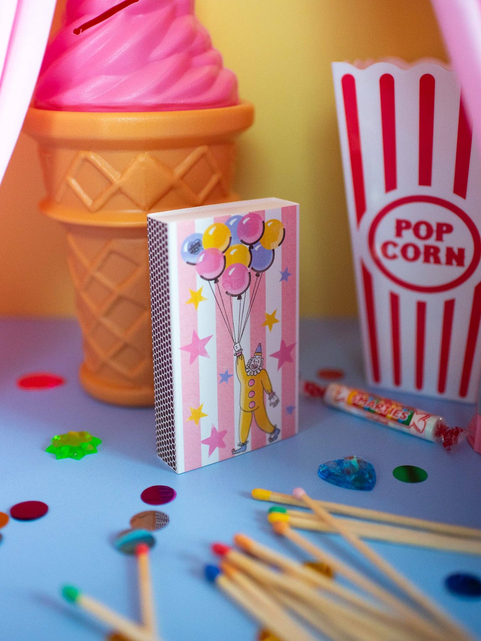 The match box features a cute clown floating away on balloons against a whimsical pink and white striped background! The design is double sided.