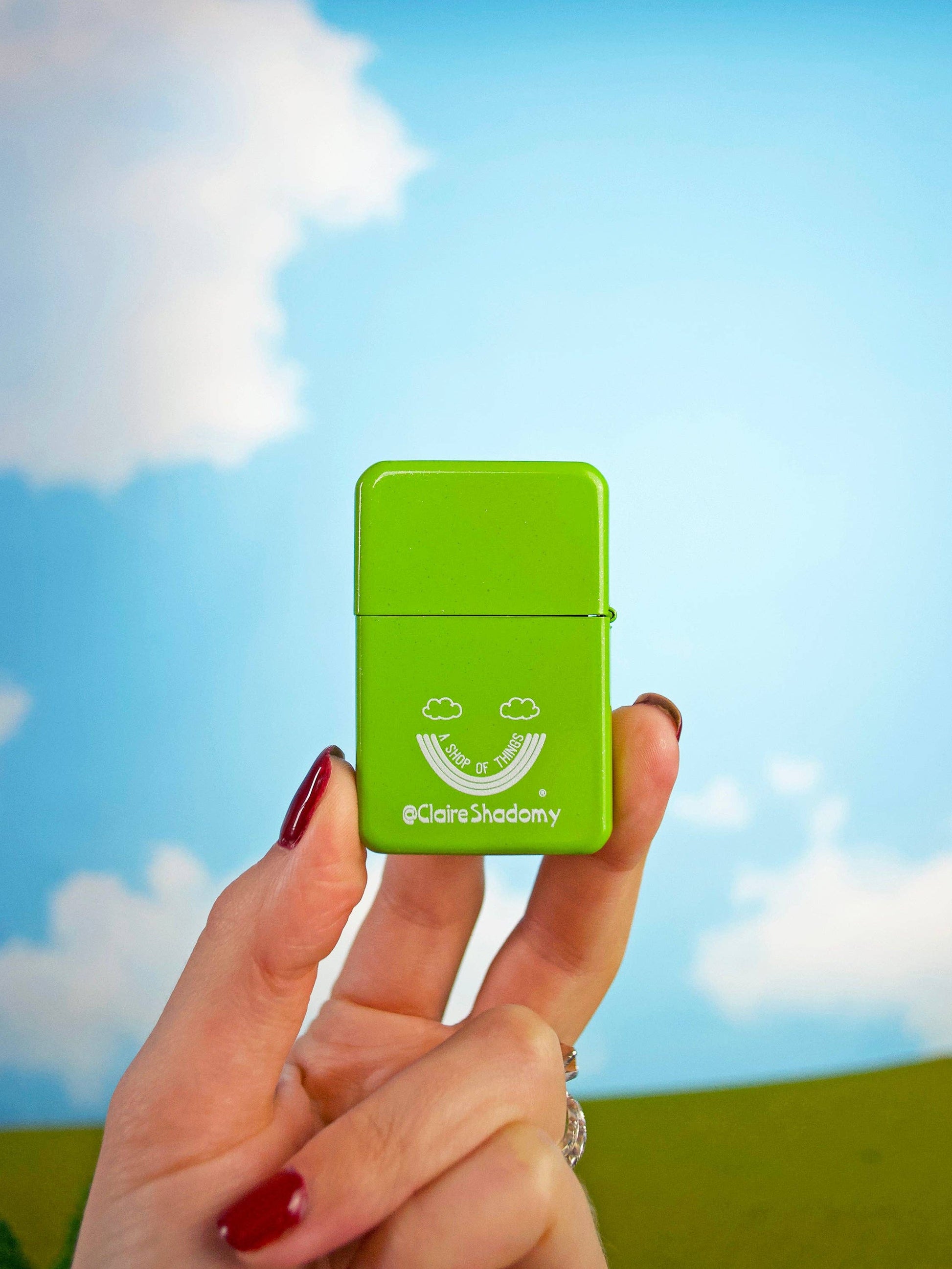 Just. Look. At. How. CUTE! This lighter features the sweetest illustration of a guinea pig wearing a blue bow surrounded by hearts. Art drawn by the talented Claire Shadomy! The lighter itself is green with a slight glittery shine.