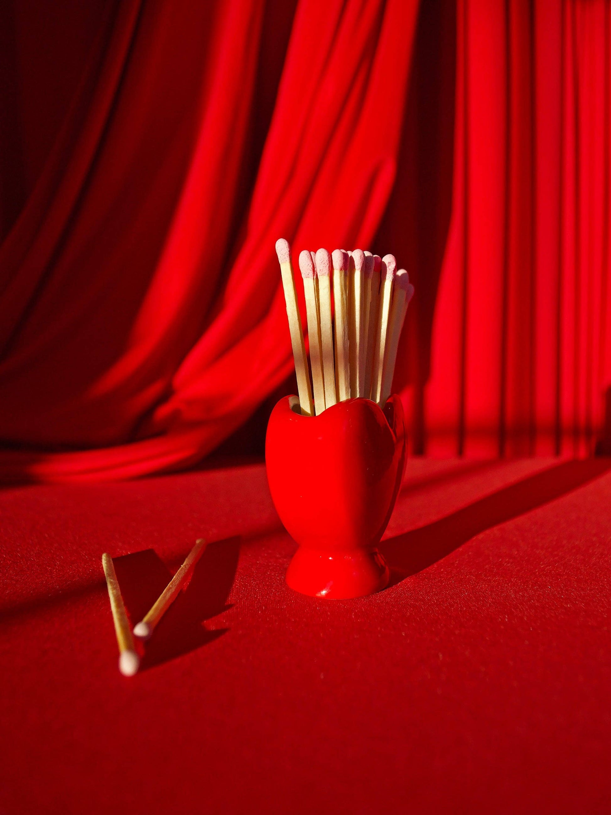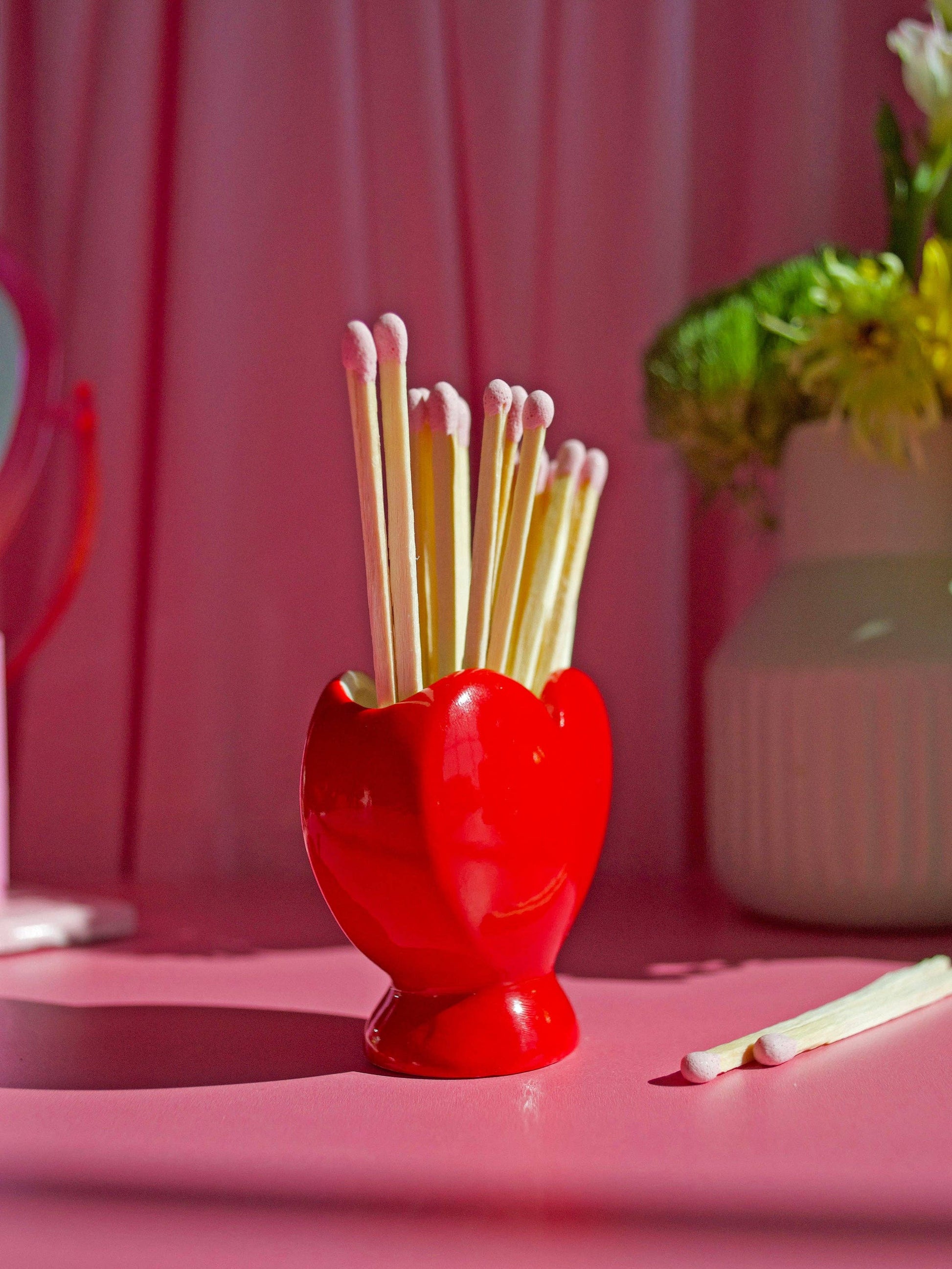 This striker is shaped like the cutest little heart you've ever seen! Comes with 25 matches measuring 3.75" each, stored conveniently inside the heart! When you need a light, tilt it over and strike a match on the base! Looks great on a desk, coffee table, shelf, etc! Also makes a cute tiny vase for tiny flowers :)