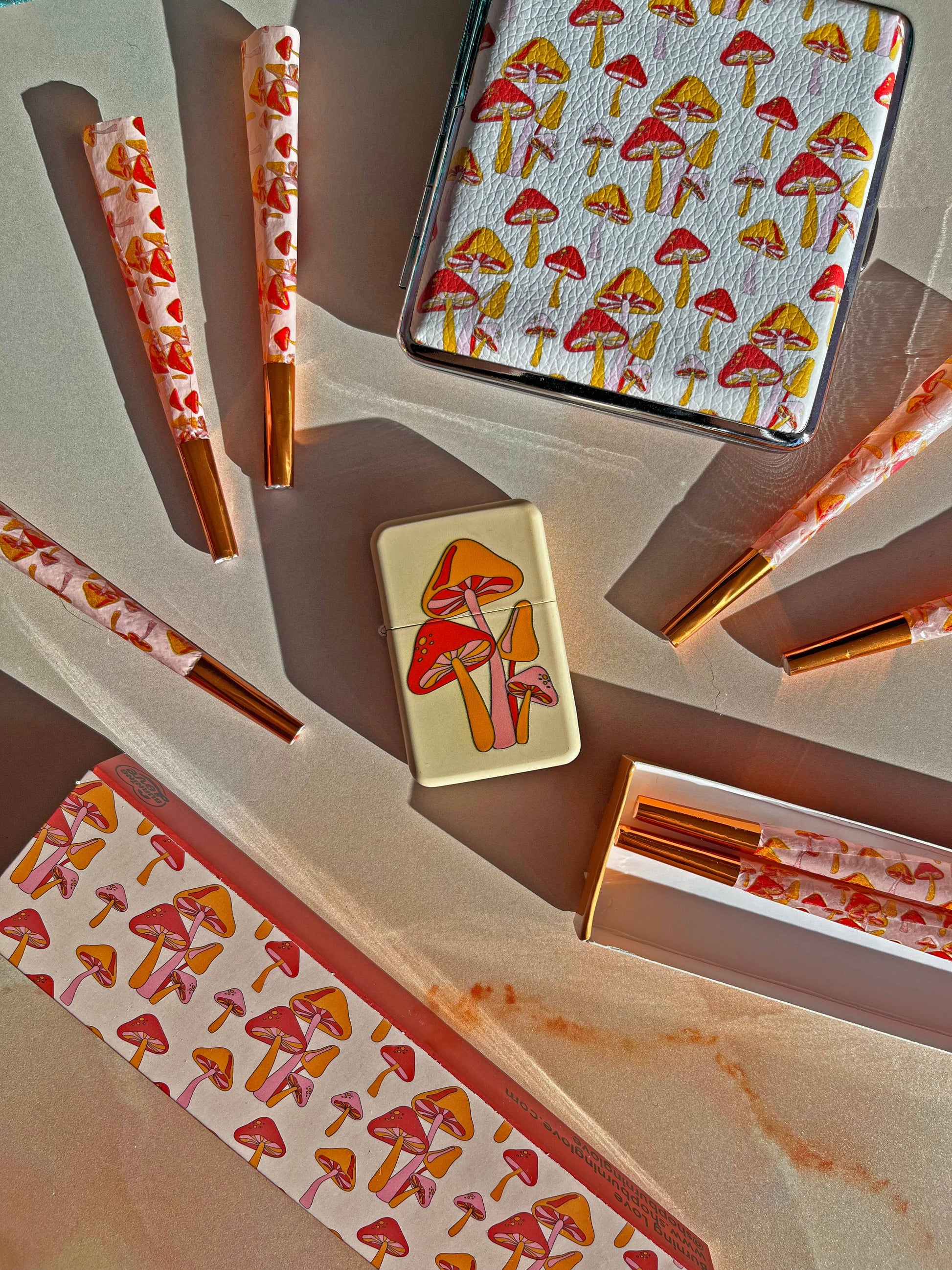 This lighter features a cute little fungi fam on the front and perfectly matches our magic mushie cones!