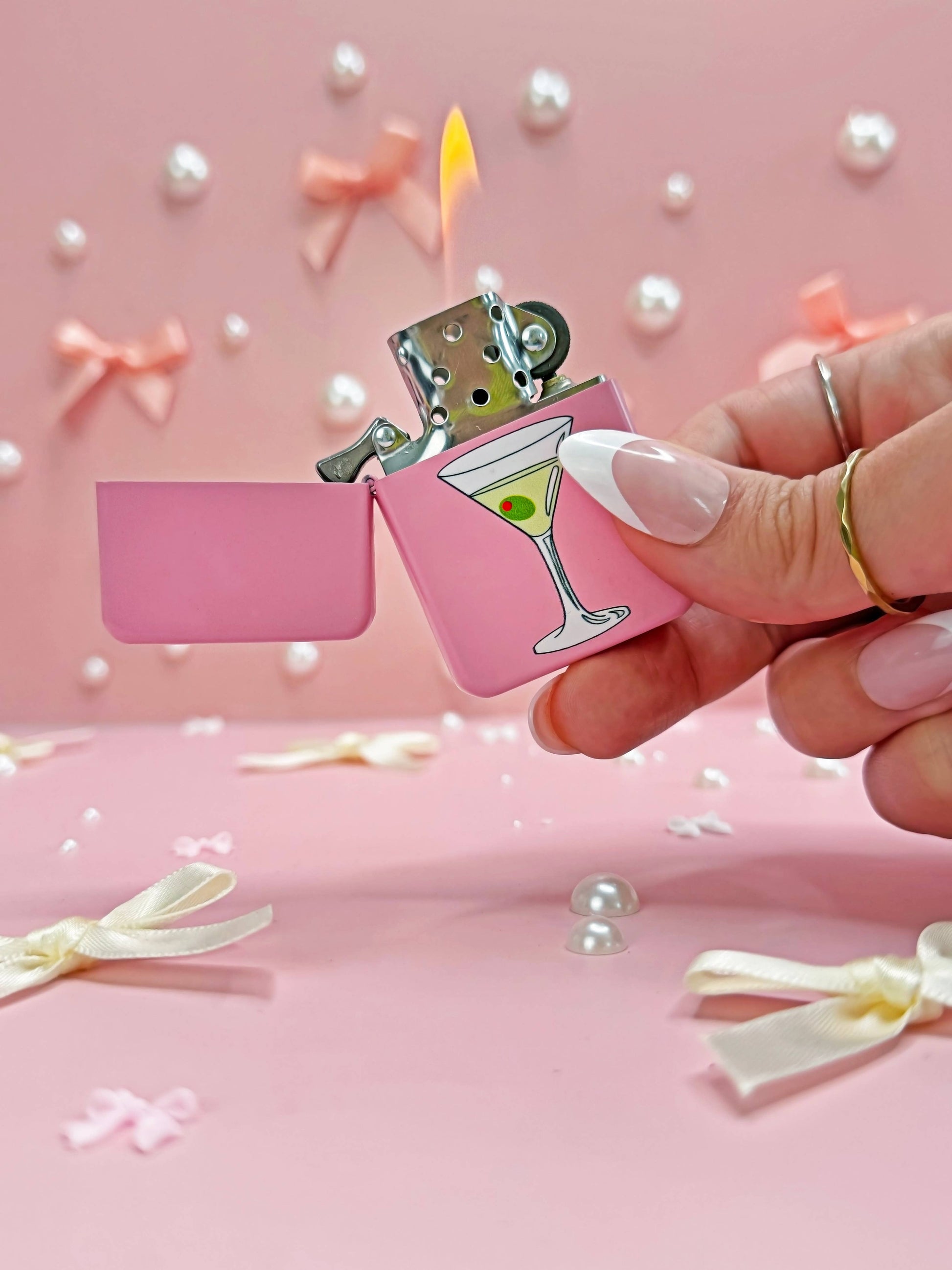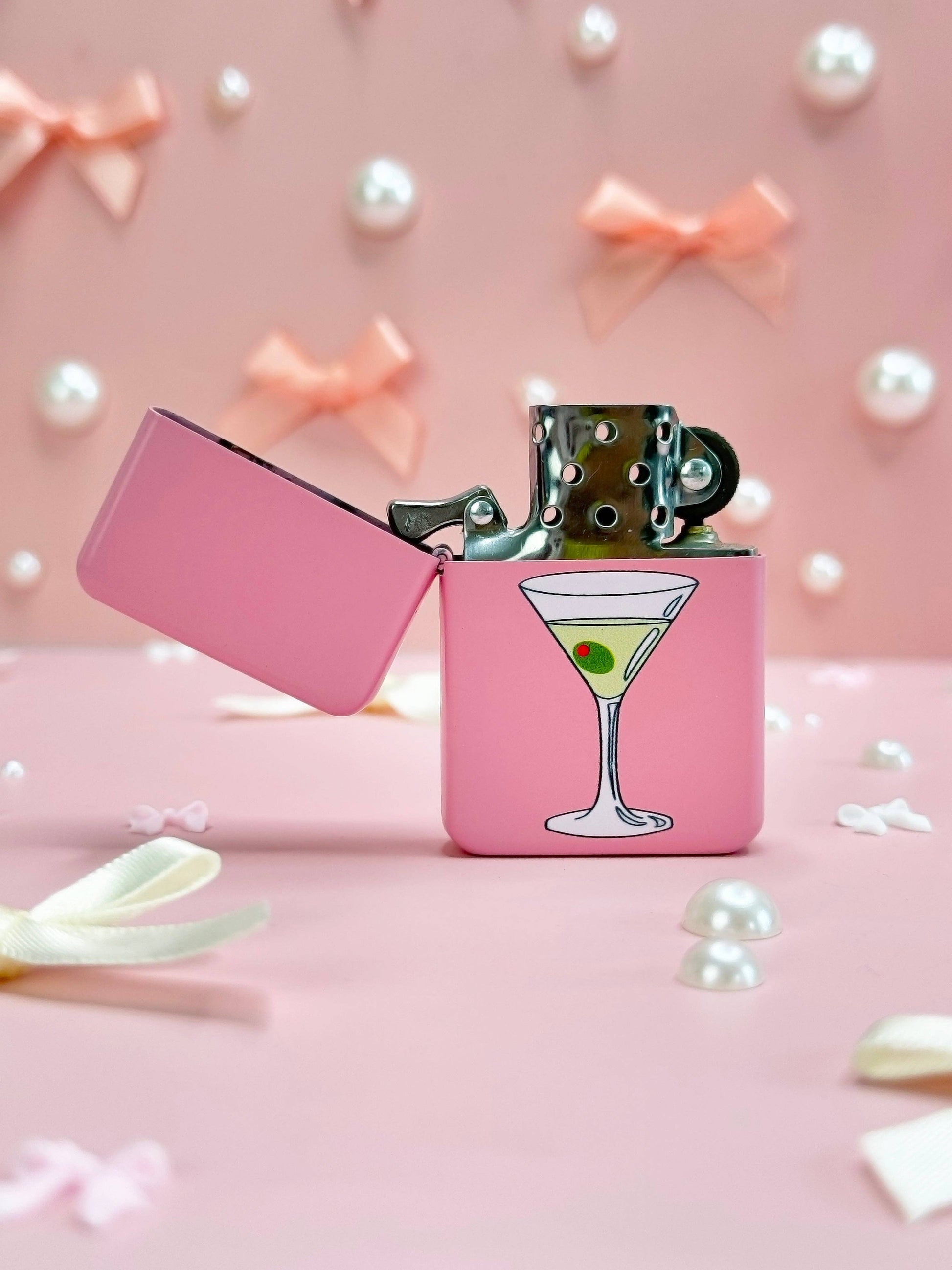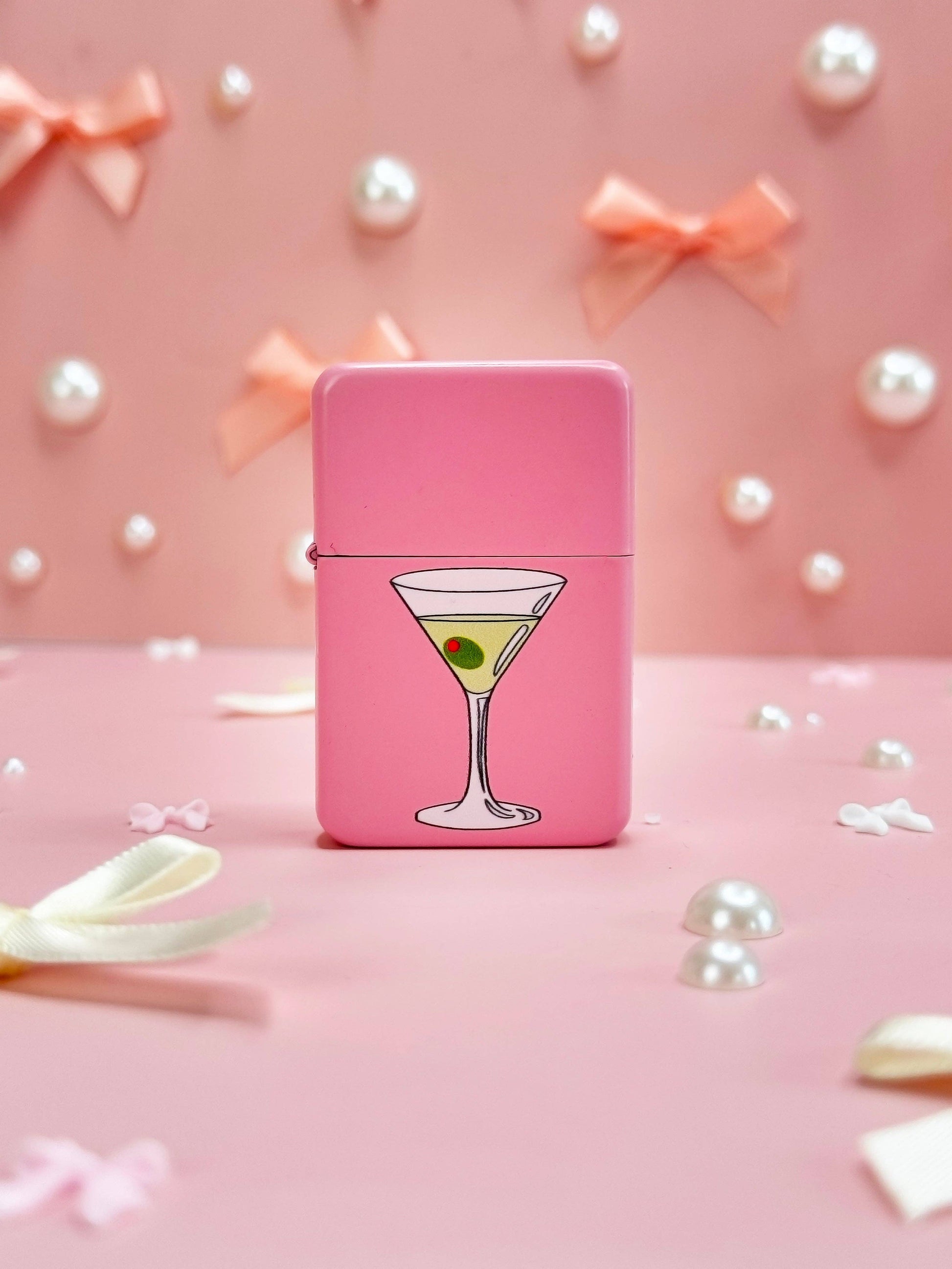 This pink lighter features an adorable little martini, complete with an olive!